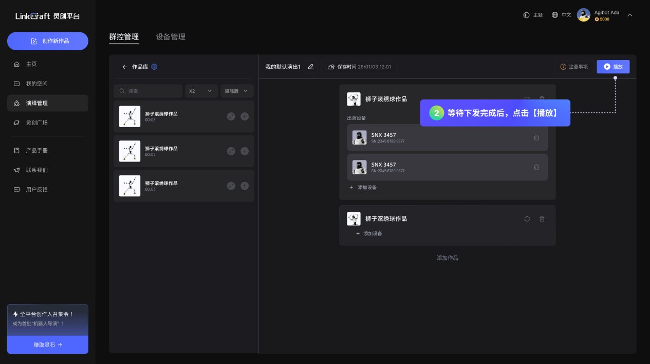 「演绎管理」:内含「设备管理」和「群控管理」两部分功能。「设备管理」用于查看机器人信息,绑定和管理机器人设备;「群控管理」用于创建并管理多设备同步的演绎任务,实现多台机器人协同表演或批量控制。